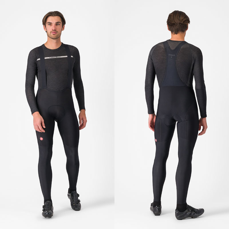 ・膝までの前面に採用されたCastelli Core Dueファブリックは、外側にナイロンの高密度ニット、内側に中空構造のポリエステルフリースを使用し、高い防風性・保温性・汗処理性を両立