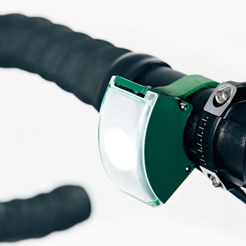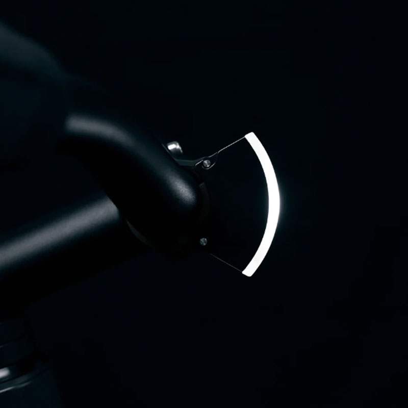 側面から光がこぼれるガラスのデザインにより前方だけでなく、側面にも反射して広範囲を照らす設計になっており、明るい光で進路がはっきりと見えるだけでなく、周囲180度の他の走行者からも見えるという安心感を得ることが可能です。